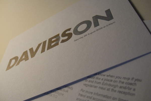 Wedding Stationery printed pantones 877 & 871on 540gsm bright white colorplan - Davies/Davidson merger